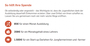 P.S. Schon jetzt stehen weitere fünf junge Leute stehen auf der Warteliste für ein Darlehen. Helfen Sie mit Ihrer Spende, ihnen Zukunftswege zu eröffnen.